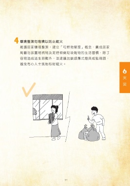 4 環境整潔勿堆積以防止縱火 維護居家環境整潔,建立「可燃物管理」概念,養成居家 周圍勿放置易燃物及定時傾倒垃圾雜物的生活習慣,除了 容易造成逃生困難外,並建議加裝感應式燈具或監視器, 避免有心人士就地取材縱火。 火 災 97