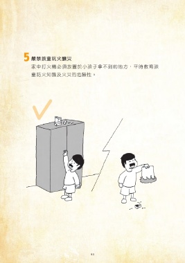 5 嚴禁孩童玩火釀災 家中打火機必須放置於小孩子拿不到的地方,平時教育孩 童防火知識及火災的危險性。 98