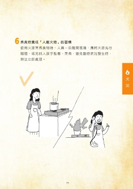 6 煮食時養成「人離火熄」的習慣 使用火源烹煮食物時,人員一旦離開現場,應將火源先行 關閉,或另找人接手監看、烹煮,避免臨時狀況發生時, 無法立即處理。 火 災 99