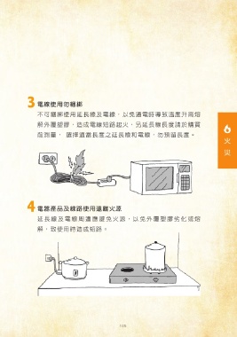 3 電線使用勿綑綁 火 不可綑綁使用延長線及電線,以免通電時導致溫度升高熔 災 解外覆塑膠,造成電線短路起火,另延長線長度請於購買 前測量, 選擇適當長度之延長線和電線,勿預留長度。 4 電器產品及線路使用遠離火源 延長線及電線周遭應避免火源,以免外覆塑膠劣化或熔 解,致使用時造成短路。 105