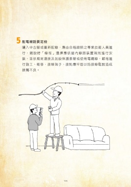 5 配電線路要定檢 購入中古屋或重新配線,應由合格證照之專業技術人員進 行,鋪設時「線徑」選擇應依屋內線路裝置規則進行安 裝,並依規定連接及加設保護套管或使用電纜線,嚴格進 行施工、維修,接線端子、接點應牢固以防接線鬆脫造成 接觸不良。 106