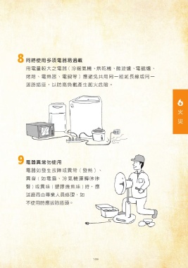 8 同時使用多項電器易過載 用電量較大之電 器( 冷 暖 氣 機 、烘 乾 機 、微 波 爐 、電 磁 爐 、 烤箱、電熱器、電鍋等)應避免共用同一組延長線或同一 迴路插座,以防高負載產生起火危險。 火 災 9 電器異常勿使用 電器如發生故障或異常(發熱)、 異音 ( 如電扇、冷氣機運轉?? 聲 ) 或 異 味 ( 塑 膠 燒 焦 味 ) 時, 應 送廠商由專業人員修理,如 不使用時應拔除插頭。 109