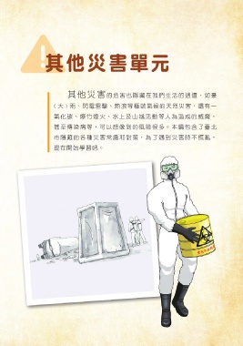 其他災害單元 其 他 災 害 的危害也隱藏在我們生活的週遭,如豪 ( 大 ) 雨、閃電雷擊、熱浪等極端氣候的天然災害,還有一 氧化碳、爆竹煙火、水上及山域活動等人為造成的威脅, 甚至傳染病等,可以想像到的風險很多。本篇包含了臺北 市隱藏的各種災害常識和對策,為了遇到災害時不慌亂, 現在開始學習吧。
