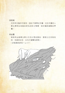 ?河流 河流有氾濫的可能性,因此不要靠近河邊,住在河邊的人 要注意附近地區的狀況及防災報導,做好隨時避難的準 備。 ?山區 坡地和山區要注意土石流災害的發生,發現土石流前兆 時,為確保安全,以先行避難為原則。 ( 詳細資訊參考→ p.237) 114