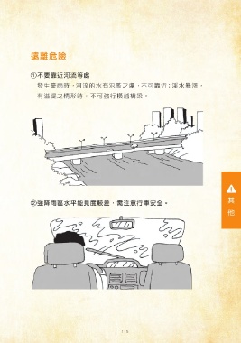 遠離危險 ?不要靠近河流等處 發生豪雨時,河 流 的 水 有 氾 濫 之 虞 ,不 可 靠 近;溪 水 暴 漲 , 有溢堤之情形時,不可強行橫越橋梁。 ?強降雨區水平能見度較差,需注意行車安全。 其 他 115