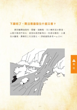 下豪雨了,需注意會發生什麼災害? 提防瞬間強降雨、雷擊、強陣風,河川慎防溪水暴漲, 山區注意坍方落石,低窪地區防範淹水。如連日豪雨,土壤 含水量高,應慎防土石流發生。( 詳細資訊參考→ p.234) 其 他 117