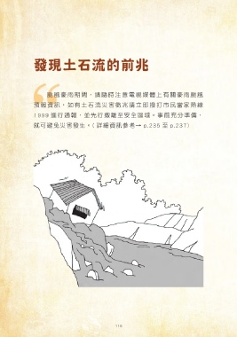 發現土石流的前兆 颱風豪雨期間,請隨時注意電視媒體上有關豪雨颱風 預報資訊,如有土石流災害徵兆請立即撥打市民當家熱線 1999 進行通報,並先行撤離至安全區域。事前充分準備, 就可避免災害發生。( 詳細資訊參考→ p.235 至 p.237) 118