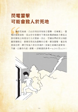 閃電雷擊 可能會致人於死地 雖然在高處,凸出的物品容易吸引雷擊,但事實上,雷 電的發展過程,係由空中雲層向下尋找對電絕緣能力最低且 路徑最短之兩者並行方式發展。因此,空曠地帶的突出物距 離雲層較近,是最容易成為雷擊的目標。聽到雷聲,看到烏 雲接近時,應立刻進入安全的場所 ( 混凝土結構的建築物、 汽車、公車的內部 ) 避 難 。( 詳 細 資 訊 參 考→ p . 2 4 0 至 p . 2 4 1 ) 124