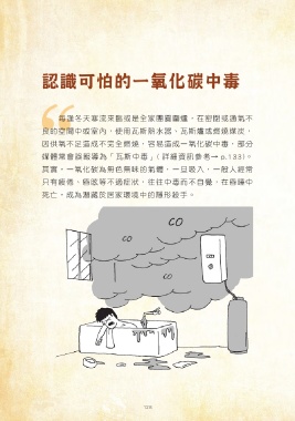 認識可怕的一氧化碳中毒 每逢冬天寒流來臨或是全家團圓圍爐,在密閉或通氣不 良的空間中或室內,使用瓦斯熱水器、瓦斯爐或燃燒煤炭, 因供氧不足造成不完全燃燒,容易造成一氧化碳中毒,部分 媒體常會誤報導為「瓦斯中毒」( 詳細資訊參考→ p.133)。 其實,一氧化碳為無色無味的氣體,一旦吸入,一般人經常 只有疲倦、昏眩等不適症狀,往往中毒而不自覺,在昏睡中 死亡,成為潛藏於居家環境中的隱形殺手。 128