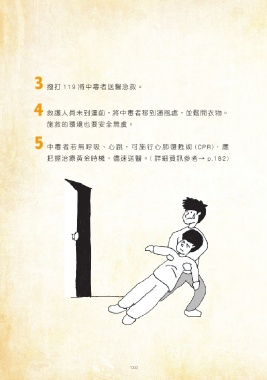 3 撥打 119 將中毒者送醫急救。 4 救護人員未到達前,將中毒者移到通風處,並鬆開衣物。 施救的環境也要安全無虞。 5 中 毒 者 若 無 呼 吸、 心 跳, 可 施 行 心 肺 復 甦 術 (CPR), 應 把握治療黃金時機,儘速送醫。( 詳細資訊參考→ p.182) 130