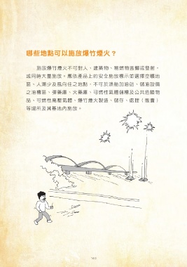 哪些地點可以施放爆竹煙火? 施放爆竹煙火不可對人、建築物、易燃物丟擲或發射, 或同時大量施放。應依產品上的安全施放標示並選擇空曠地 區、人潮少及風向佳之地點,不可於漁船加油站、儲油設備 之油槽區、彈藥庫、火藥庫、可燃性氣體儲槽及公共危險物 品、可燃性高壓氣體、爆竹煙火製造、儲存、處理(販賣) 等場所及其基地內施放。 140