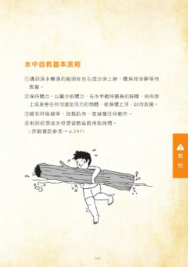 水中自救基本原則 ? 遇 到 溪 水 暴 漲 而 被 困 在 岩 石 或 沙 洲 上 時, 應 保 持 冷 靜 等 待 救援。 ? 保持體力,以最少的體力,在水中維持最長的時間,利用身 上或身旁任何可增加浮力的物體,使身體上浮,以待救援。 ? 緩 和呼吸頻率, 放 鬆 肌 肉 , 並 減 慢 任 何 動 作 。 ?利用仰漂或水母 漂 姿 勢 延 長 待 救 時 間 。 ( 詳細資訊參考→ p.247) 其 他 143